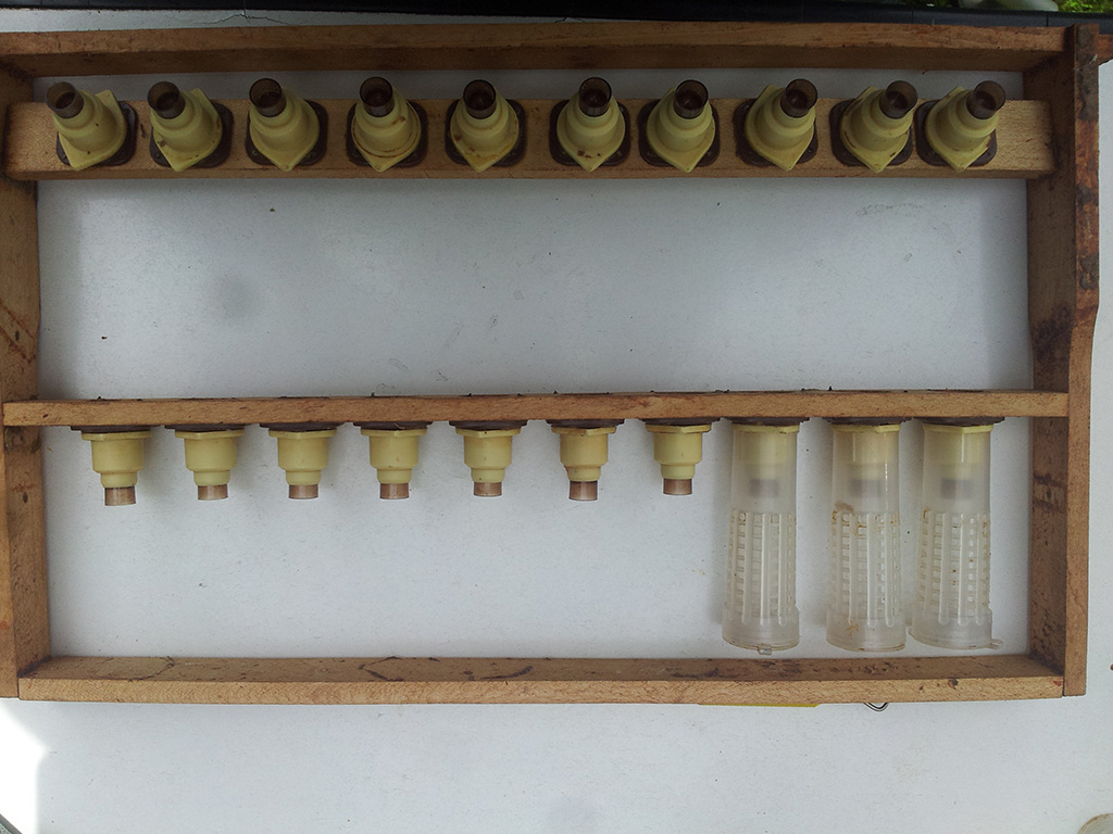 etwa drei Tage alte Maden aus der Brutwabe entnommen und in die Weiselnäpfchen gelegt. Wenn alle Näpfchen mit Maden belegt sind, wird der Zuchtrahmen in den weisellosen Sammelbrutableger gegeben. Aufgrund der Weisellosigkeit und dem Nichtvorhandensein von Stiften oder Maden, herrscht das große Bedürfnis eine Königin nachzuschaffen.