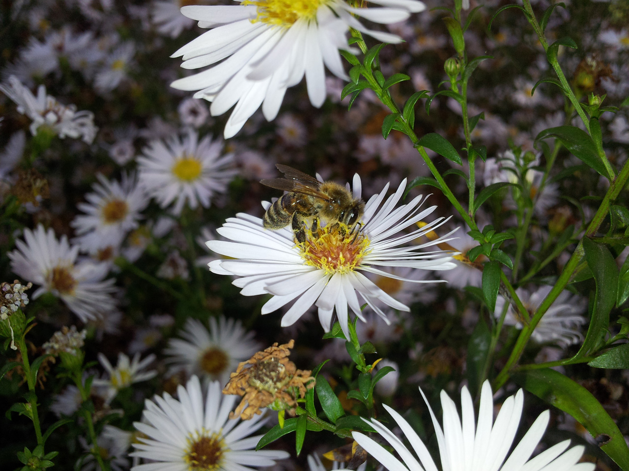 Nach einem Tag Arbeit an den Bienen wollten wir uns etwas entspannen und entschlossen uns an der Leine zu angeln. Auf der gegenüberliegenden Uferseite empfing uns ein "Wald" voller Springkraut. Springkraut ist zu dieser Jahreszeit für Bienen und andere Insekten der Nektar und Pollenspender. Die Bienen müssen, um an den Nektar zu gelangen, tief in die Blüte krabbeln und werden dabei komplett mit weißem Pollen bedeckt. In Imkerkreisen ist dann immer von "Geisterbienen" die Sprache.